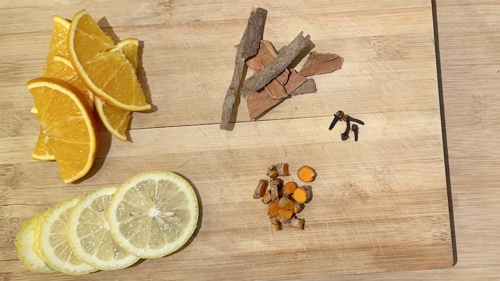 • חיתוך שאר המרכיבים: פרסו את התפוז, הלימון והג'ינג'ר לפרוסות דקות. אספו את כל התבלינים והקליפות לצורך בישול.