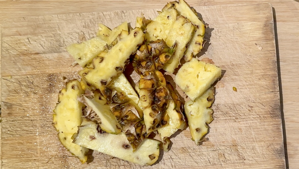 • איך להכין את האננס: שטפו את האננס מבחוץ, קלפו אותו וחתכו את הקליפות לחתיכות בינוניות.