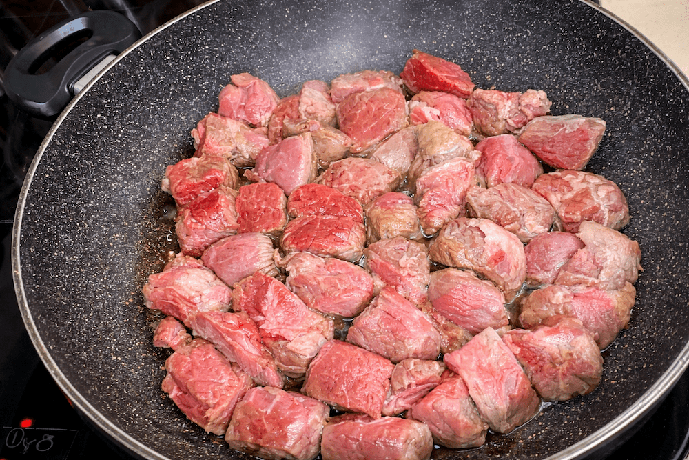 - נצרוב את קוביות הבשר בשכבה אחת, עד שהן מקבלות השחמה יפה מכל הצדדים.