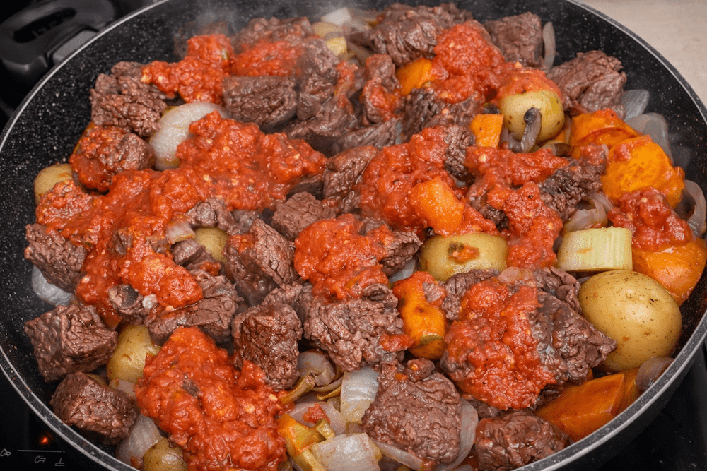 - נחזיר את קוביות הבשר לסיר, ונוסיף את העגבניות המרוסקות עם הסרירצ’ה.
