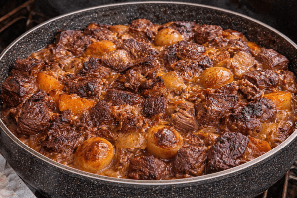 תבשיל בשר צלעות ללא עצם רך בתנור עם ירקות שורש ופטריות