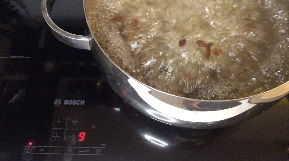 - ברגע שהמים מתחילים לבעבע, הנמיכו את הלהבה לחום נמוך עד שתיראו בועות קטנטנות