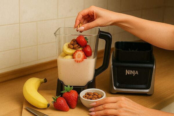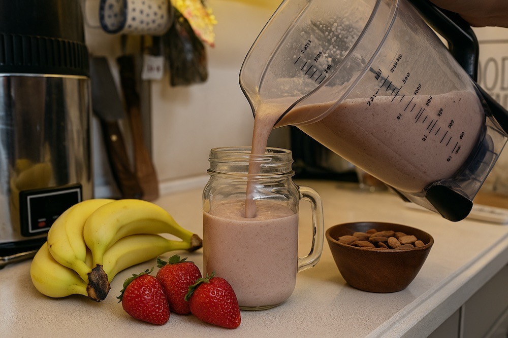 אני מכינה את השייק תות בננה ושקדים כשאני מרגישה שהגוף שלי צריך משהו שמאזן בלי להעמיס.
